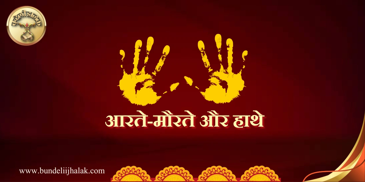 यह आरते मौरते तथा ‘हाथे’ यह प्रदर्शित करते हैं कि घर में वर-वधू का आगमन हो चुका है। ‘आरते-मौरते’ बुन्देली शब्द ही है इसके आधार पर यह लगता है कि ‘मौर’ धारण करने वालों की आरती करने हेतु हम प्रतीक्षारत हैं।